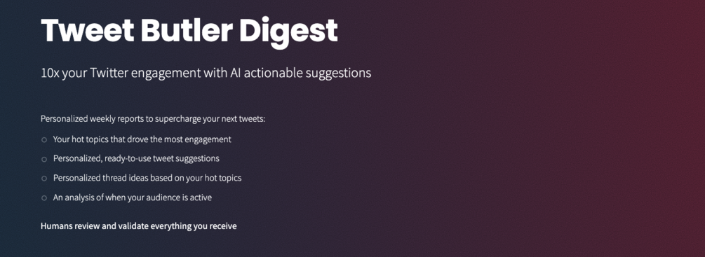 2) Tweet suggestions generated by AI and polished by our team. At least 5, probably more. You do whatever you want with them, post directly or edit them, they are all yours.